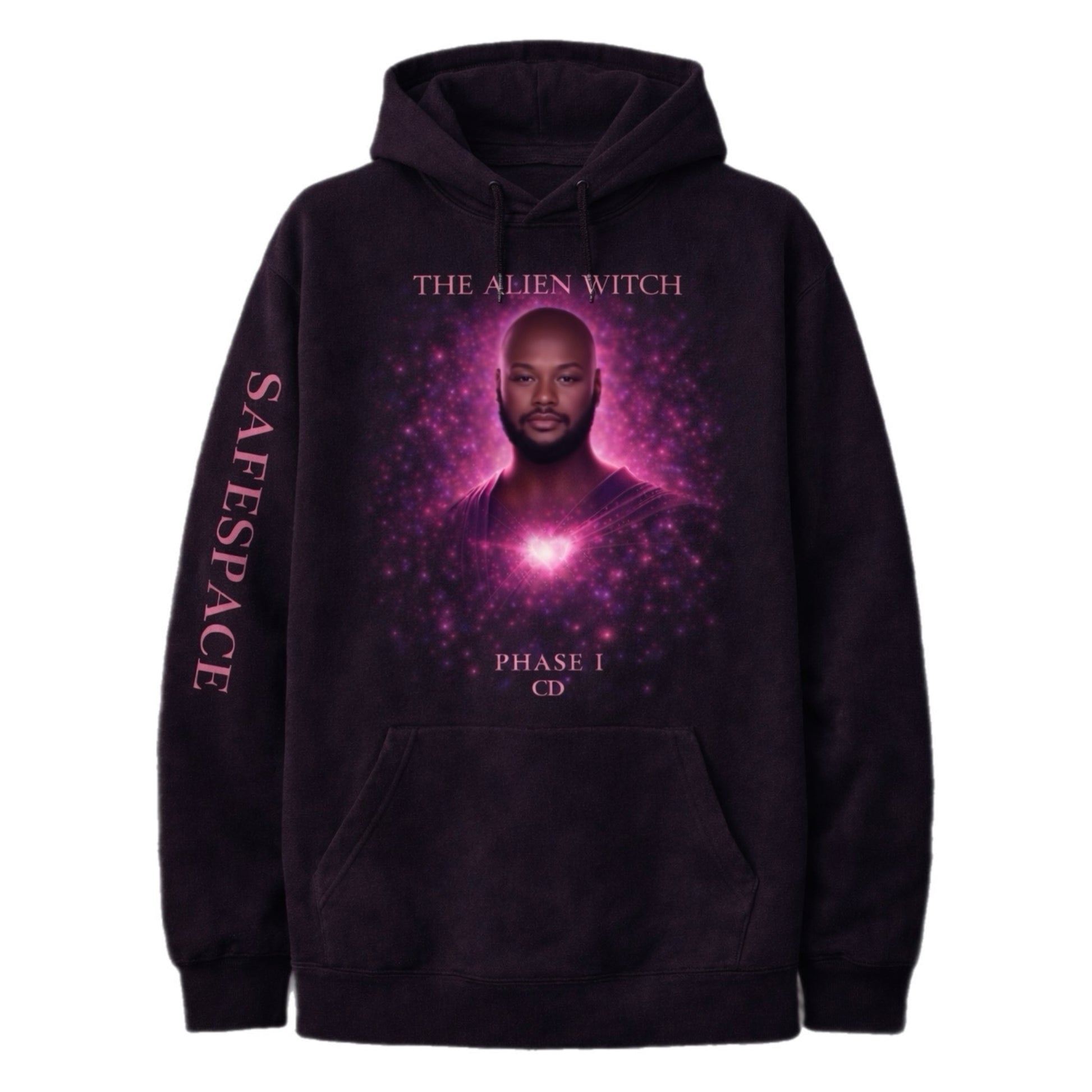This hoodie features the official Alien Witch artwork from Phase I, glowing in signature magenta stardust energy. At the center: a radiant heart — symbolizing power, protection, and emotional truth. The left sleeve carries the SAFESPACE mark, grounding the piece in the world it was born from.